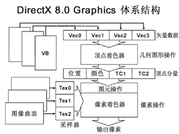 显示部分担任图形处理的关键,分为DirectDraw(DDraw)和Direct3D(D3D),前者主要负责2D图像加速。下图为DirectX8.0 Graphics 体系结构: