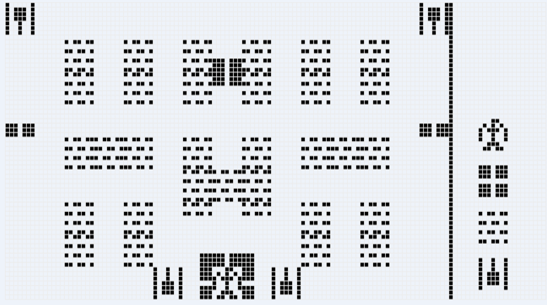 界面被竖线①(位于自左起第106列)分为左右两部分,左半部分包含105列是游戏战斗区。右半部分22列是状态显示区。游戏区进行战斗;状态显示区用于显示游戏数据和状态,如关卡号,玩家剩余生命,游戏时间等等。