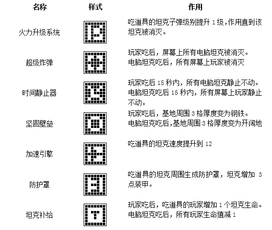 每个道具都可以被电脑或者玩家坦克吃掉,吃掉后产生的作用就分别作用于电脑或者玩家的坦克。如表7-7所示是道具设定。道具在屏幕上的时候不断闪烁,每个道具的存留时间是10秒。