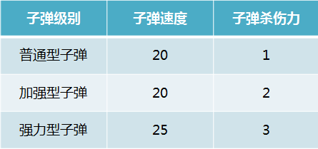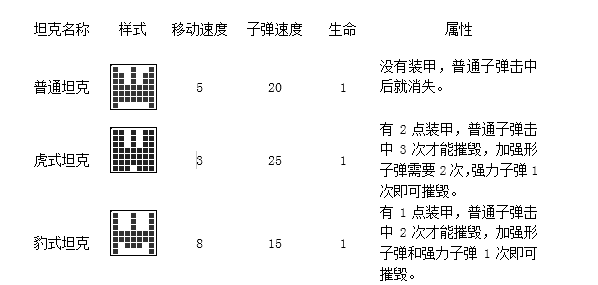 游戏的火力规则主要面向玩家子弹的属性,与电脑控制坦克无关,如表7-2所示。不同级别的子弹有火力的高低之分。速度代表子弹移动快慢,杀伤力表示子弹对目标装甲及生命的杀伤点数。