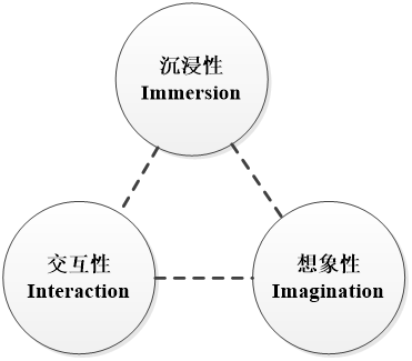 1993年,虚拟现实交互技术专家Burdea在国际上提出了著名的虚拟现实交互三角形,描述了虚拟现实交互技术的三个重要特性:沉浸性(Immersion)、交互性(Interaction)和想象性(Imagination),如图所示。