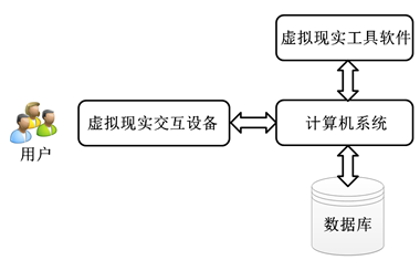 典型的虚拟现实交互系统主要由计算机、应用软件系统、输入输出设备、用户和数据库等组成,如图 所示。