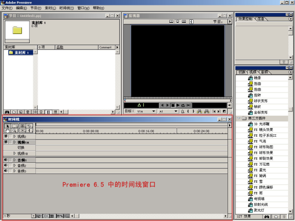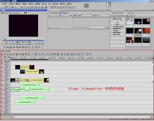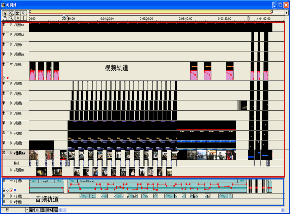 时间线是视频剪辑的主要工作场所,用来按照时间顺序放置各种素材。以上介绍过的视频编辑软件中都包含了这样的时间线。如Premiere(图5-13)和会声会影uleadstudio的时间线窗口(图5-14)。