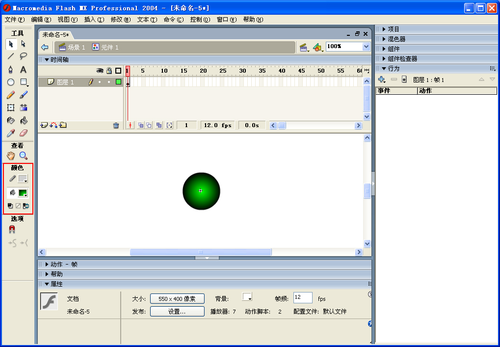 (3)上色:设置圆形属性,即圆形的轮廓颜色、填充色、圆心位置等等。在 Flash 的工具栏里,对轮廓、填充属性的设置,如图6-10中标示出来的工具完成。