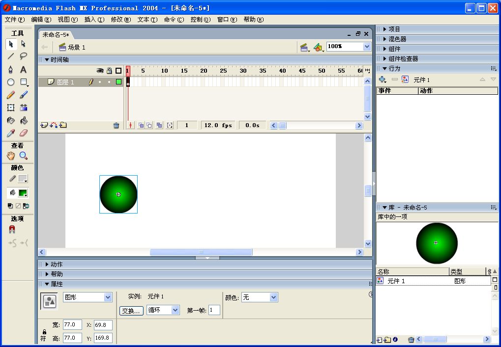 (2)原型绘画:选择椭圆工具,选择“插入——元件——图形”,并在工作区域中绘制一个正圆,如图6-9所示。