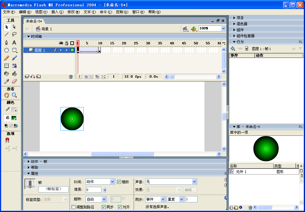A.从库中将小球拖放到场景中,如图6-11所示。可见第一帧影格处变为实心黑点,表示该帧已有填充物。