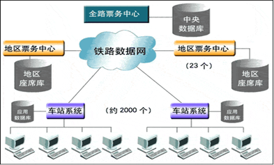 数据库的应用领域非常广泛,不管是家庭、公司或大型企业,还是政府部门,都需要使用数据库来存储数据信息。传统数据库中的很大一部分用于商务领域,中国铁路客票发售和预定系统是一个典型的分布式数据库应用系统,系统中建立一个全路中心数据库和23个地区数据库,如图所示。