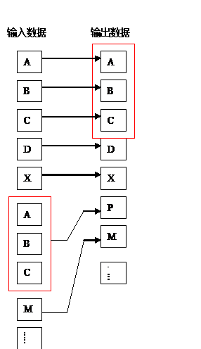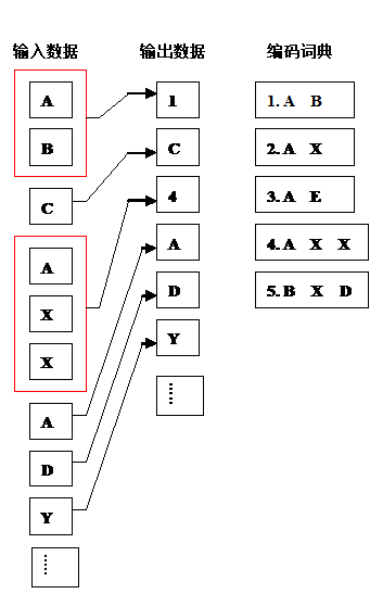 第二种算法的思想是从输入的数据中创建一个“短语词典”,这类短语不一定有具体的含义,可以是任意字符的组合。在编码过程中遇到在“短语词典”中出现的短语是,编码器就输出这个词典中的短语“索引号”,而不是短语本身。其概念如右图所示。