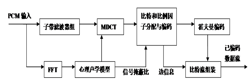 MP3压缩编码是一个国际性全开放的编码方案,其编码算法流程大致分为时频映射、心理声学模型、量化编码三大功能模块,这三个功能模块是实现MP3 编码的关键。