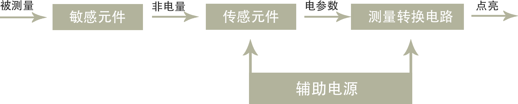 传感器通常由敏感元件、传感元件、测量转换电路以及辅助电源四部分组成。敏感元件在传感器中是直接感受被测量,转换元件把敏感元件的输出作为它的输入,转换成电路参量,电路参量接入测量转换电路,便可转换成电量输出。辅助电源是提供传感器正常工作。