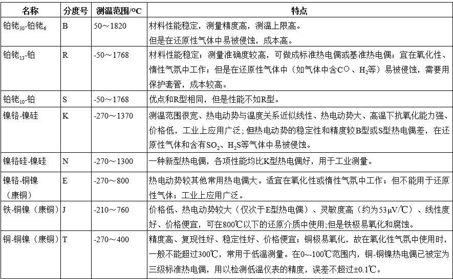 为了保证在工业现场应用可靠,并具有足够的精度,热电偶的热电极材料在被测温度范围内应满足:在规定的测温范围内有较高的精确度,热电势随温度的变化率要大,热电势与温度尽可能成线性对应关系,而且物理化学性能稳定,具有足够的机械强度、复制性和互换性好等要求,满足这些条件的热电偶材料并不很多。我国把性能符合专业标准或国家标准并具有统一分度表的热电偶材料称为定型热电偶材料。