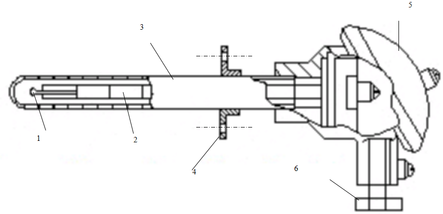 1-热电偶工作端 2-绝缘管 3-保护套管 4-安装法兰 5-接线盒 6-引线口