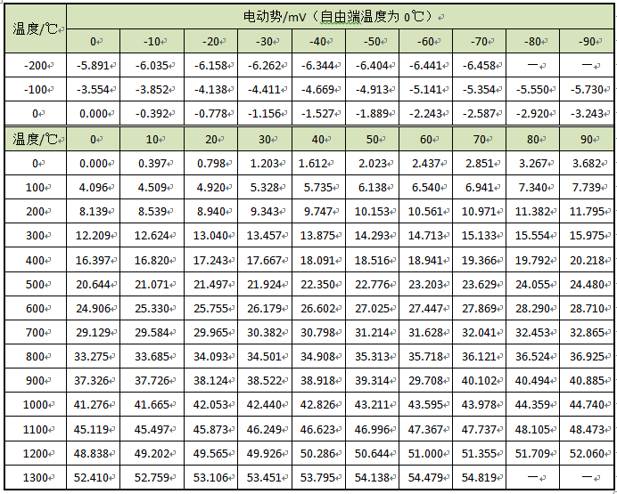 我国从1991年开始采用国际计量委员会规定的“1990年国际温标”(简称ITS-90)的新标准,按此标准指定S、B、E、K、R、J、T、N八种标准化热电偶为我国统一设计型热电偶。每种热电偶均制定了相应的分度表,并且有相应的线性化集成电路与之对应。可以直接从热电偶的分度表查温度与热电动势的关系但是注意分度表上显示均是自由端(冷端)温度为0C时的热电动势,本教材附录了工业中常用的K型热电偶的分度表。
