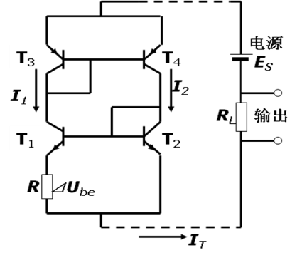 AD590的测温原理可以如图3-15所示,图中性能相同的晶体管T3、T4将IT分为两个相等的电流I1和I2,起恒流作用。晶体管T1、T2起感温作用,T2中的电流密度J2为T1中电流密度J1的8倍,即J2=8J1 , T1和T2的发射结电压Ube1和Ube2反极性串连后施加在R上,则R的端电压⊿Ube为