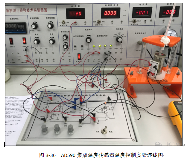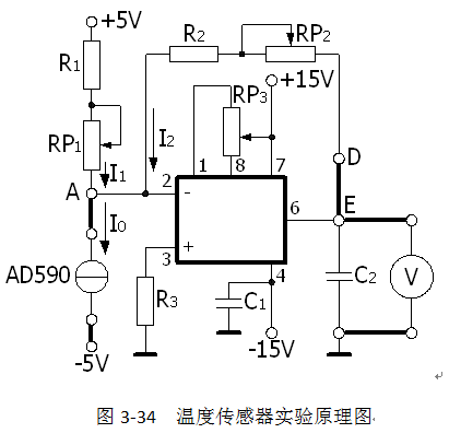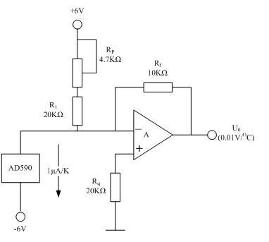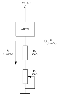 AD590集成温度传感器实质上是一种半导体集成电路,它是利用晶体管的b-e结(PN结)压降的Vbe与热力学温度T和通过发射极电流密度J的关系实现对温度的检测。