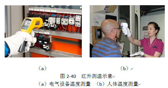 在自然界中,一切温度高于绝对零度的物体都在不停地向周围空间发出红外辐射能量。物体的红外辐射能量的大小及其按波长的分布与它的表面温度有着十分密切的关系。因此,通过对物体自身辐射的红外能量及波长的测量,便能测定辐射体的表面温度。红外测温示意图如图2-40所示。