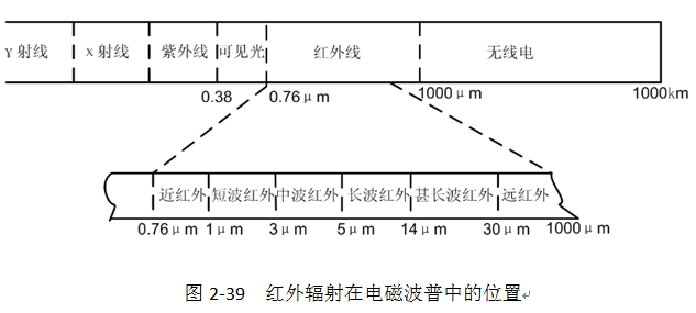 红外技术是研究红外辐射(Infra-red radiation)的产生、传播、转化、测量及其应用的技术。红外辐射俗称红外线,是一种不可见光。由于它是位于可见光中红色光线以外的光线,所以被称为红外线。它的波长在 之间,一般按波长的范围可分为近红外、中红外、远红外、极远红外四类,但划分的方法因学科或技术领域不同而异。红外辐射在电磁波普中的位置如图2-39所示。