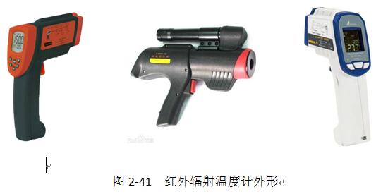 红外辐射温度计(又称红外测温仪)既可用于高温测量,又可用于冰点以下的温度测量,所以它是辐射温度计的发展趋势。市售的红外辐射温度计的温度范围为,中间分成若干个不同的规格,可根据需要选择适合的型号。红外辐射温度计的外形如图2-41所示。