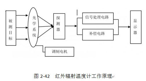 红外辐射温度计由光学系统、光电探测器、信号放大器及信号处理、显示输出等部分组成。光学系统汇聚其视场内的目标红外辐射能量,视场的大小由温度计的光学零件及其位置确定。红外能量聚焦在光电探测器上并转变为相应的电信号。电信号经过放大器和信号处理电路,并按照仪器内的算法和目标发射率校正后,得到被测目标的温度值。除此之外,还应该考虑目标和温度计所在的环境条件,如湿度、气氛、污染和干扰等因素对性能指标的影响及修正方法。红外辐射温度计测温的工作原理图如图2-42所示。