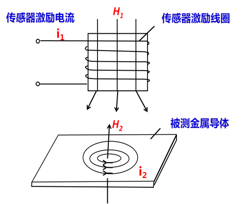 当电涡流线圈通入高频正弦交变电流I时,在线圈周围空间将产生一个高频的正弦交变磁场H