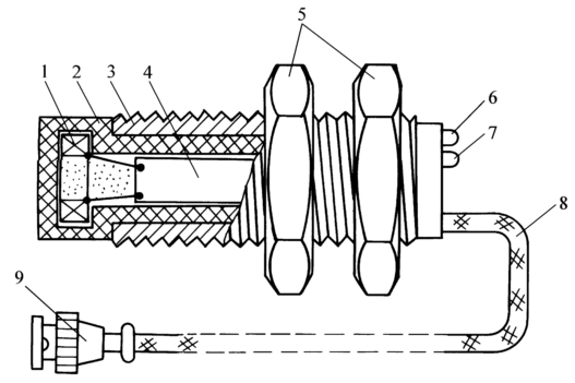 1—电涡流线圈 2—探头壳体 3—壳体上的位置调节螺纹 4—印制线路板 5—夹持螺母 6—电源指示灯 7—阈值指示灯 8—输出屏蔽电缆线 9—电缆插头