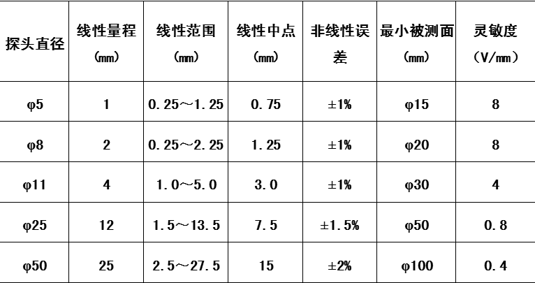 从表中可以看出,电涡流探头的直径越大,检测的线性范围就越大,但是灵敏度却是越低。