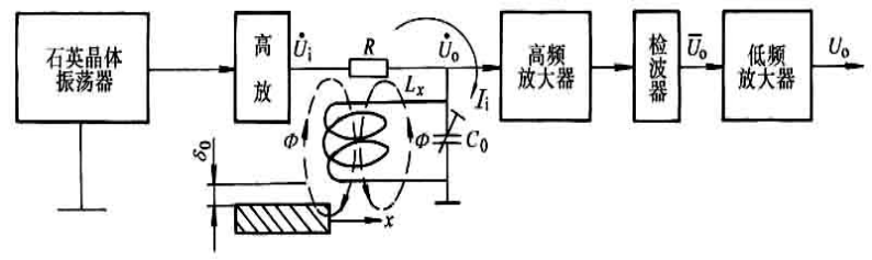 石英振荡器产生稳频、稳幅高频振荡电压用于激励电涡流线圈,被测金属材料在高频磁场中产生电涡流,引起电涡流线圈端电压的衰减,再经高放、检波、低放电路,最终输出的直流电压U。反映了被测金属物体对电涡流线圈的影响,如图4-4所示。调幅式的缺点是电压放大器的放大倍数的漂移会影响测量精度,必须采取各种温度补偿措施。