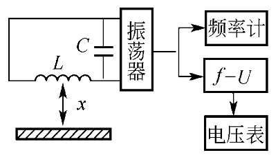 如图4-5所示,将电涡流线圈接入LC振荡器,作为组成LC振荡器的电感元件。当电涡流线圈与被测导体距离x改变时,在涡流效应的影响下,传感器的电感变化,导致振荡频率的变化,该变化的频率是距离x的函数,此频率可直接送入频率计。如果要用模拟仪表进行显示或记录,则必须使用鉴频器,将∆f转换为电压∆U。