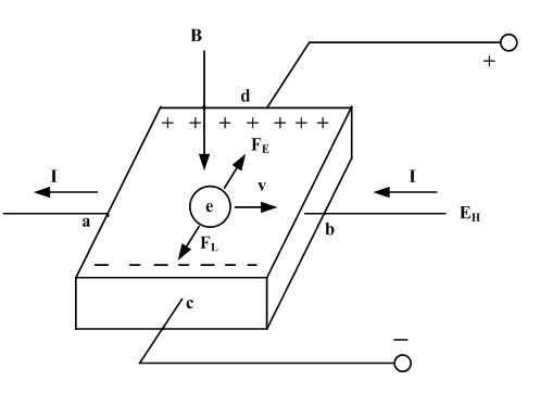 将导体或者半导体置于磁场强度为B的磁场中,并且在垂直于磁场方向的通入控制电流I,那么在导体的垂直于磁场和控制电流方向的两个端面之间会出现电动势EH,这一现象便是霍尔效应,这个电动势被叫做霍尔电动势。能产生霍尔效应的导体或者半导体称为霍尔元件,如图4-7所示。