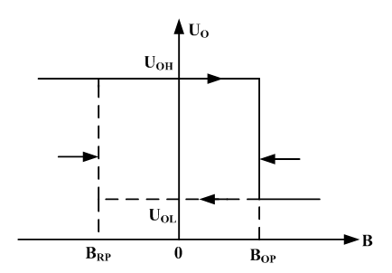 开关型霍尔集成电路的输出特性如图4-13所示,其中Bop为工作点“开”的磁感应强度,B为释放点“关”的磁感应强度。当外加的磁感应强度超过动作点Bop时,OC门由高阻态变成导通,输出低电平,当磁感应强度降到动作点Bop以下时,传感器输出电平不变,一直要降到释放点B