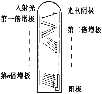 光电管输出较小,实际应用中常采用光电倍增管,其结构与光电管相似,如图4-21所示,在阳极和阴极之 间有若干个光电倍增极(又称二次发射极),涂有光敏 物质。