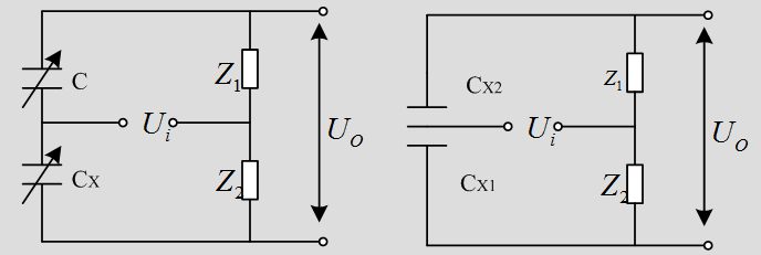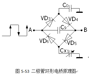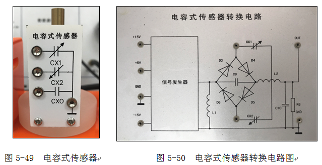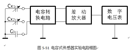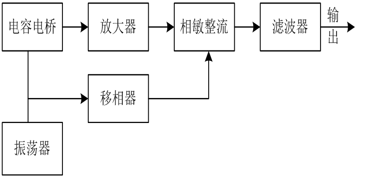 动极板未受外力作用时,交流电桥平衡,输出电压为零,当动极板向上运动时,假设此时C1减小,C2增大,交流电桥输出电压增大,且输出电压和输入电压Ui反相;反之动极板向下运动时,C1增大,C2减小,交流电桥输出电压绝对值增大,此时输出电压和输入电压Ui同相。如果需要辨别动极板的移动方向,我们也要将交流电桥的输出电压经过相敏检波电路输出。
