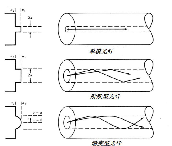 按纤芯的折射率分布的不同可以分阶跃型、梯度型和W型三种。
