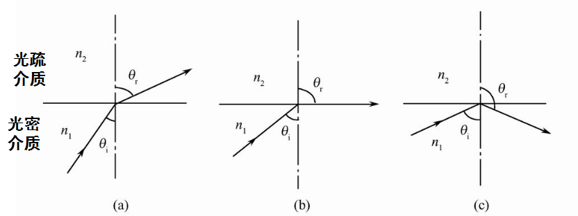 当光由光密物质出射至光疏物质(即n1>n2)时,一部分光线会以折射入光疏介质,其余部分光线反射回光密物质。