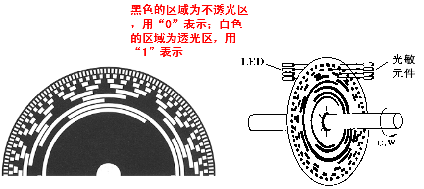 绝对式光电编码器的码盘是由玻璃或高分子材料制成,采用的是黑白分区的形式,分别表示不透光区和透光区。黑色的区域为不透光区,用“0”表示;白色的区域为透光区,用“1”表示,在每个码道上都有一组光电元件,如图5-35(b)所示。