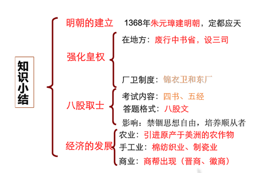 引导学生比较全面地掌握明朝加强君权的措施,废行中书省、设立三司,废丞相和中书省,权分六部,设置锦衣卫,以八股取士。