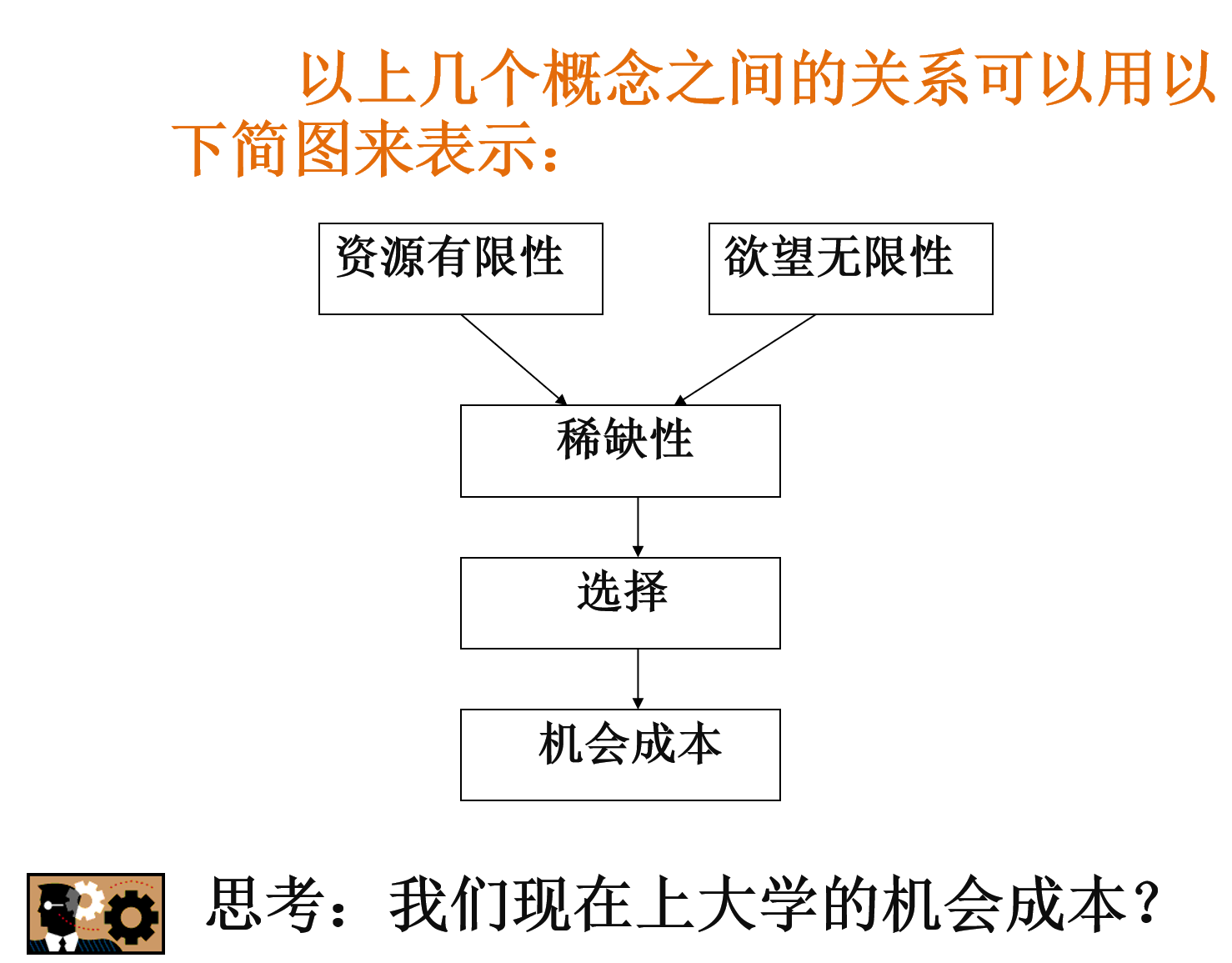 •由于稀缺性的存在,人们必须对现有的资源使用做出选择:是用于生产x还是y;由于你的货币收入有限,你必须决定是用于购买A还是B。因此稀缺性隐含着选择,选择是稀缺性的必然结果。既然要选择,那么每一个经济人需不需要付出何种代价呢?