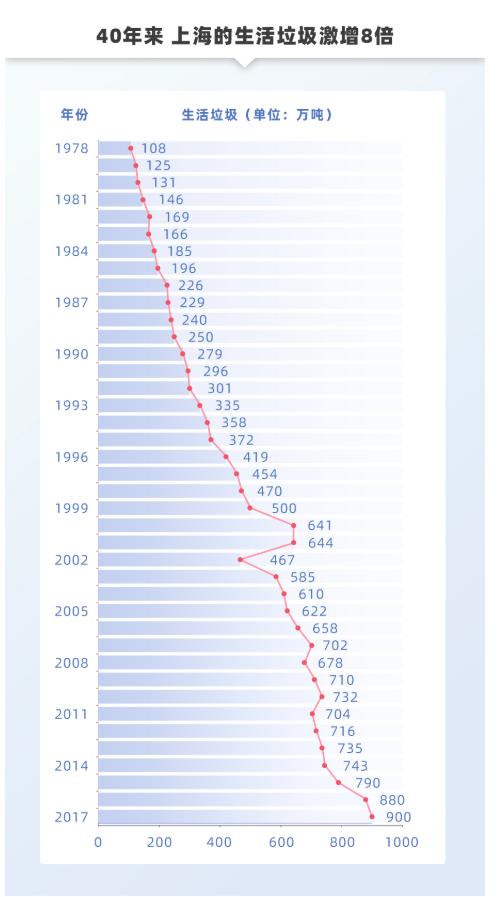 上海作为国内经济最发达的城市之一,其垃圾产生量也非常高。1978年,上海的生活垃圾产生量为108万吨,至2017年已达900万吨,40年里增加了近8倍。经济的高速增长不仅推动消费增长,也导致生活垃圾的激增。