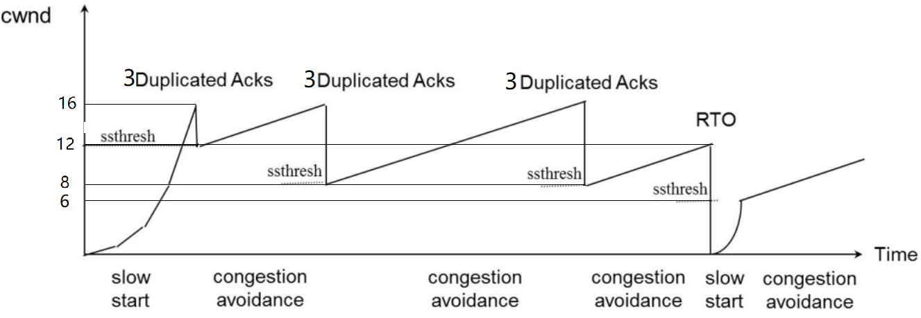 拥塞避免:ssthresh(slow start threshold),当cwnd >= ssthresh时,就会进入“拥塞避免 算法”,一般来说是65535字节,到达阈值之后线性增长。
