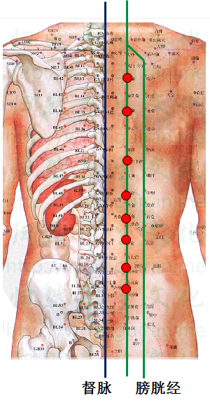 分布:分布上也有一定的规律,均位于足太阳膀胱经的第一分支上(距脊柱正中1.5寸),上下排列与内脏相应。内脏高者,其位也高。主要用于调理相应的内脏病症。