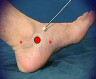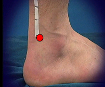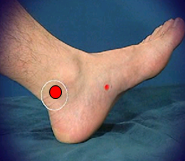 位置:在足内踝与跟腱连线中点。足后跟有一条较粗的肌腱,称跟腱,在足内踝高点向后作一平线到跟腱,在这一连线的中点凹陷处。