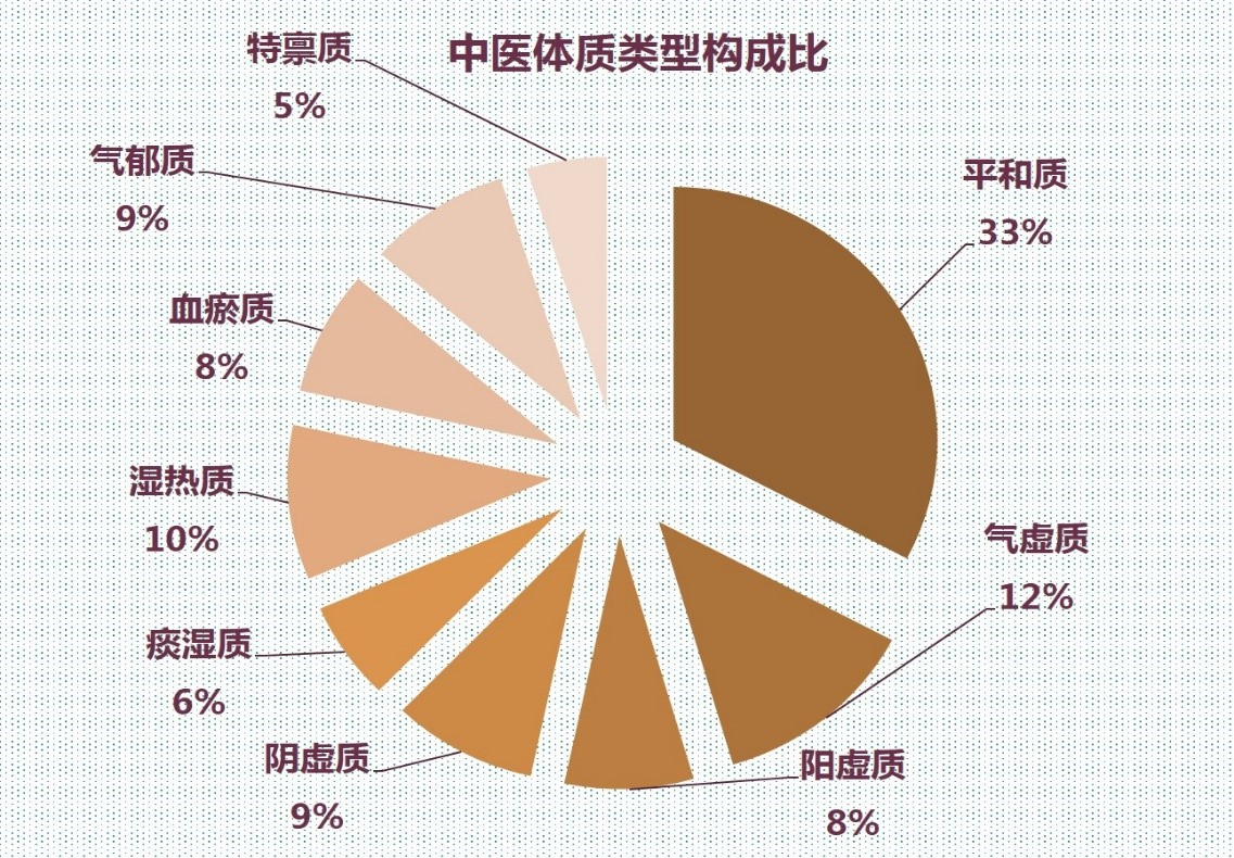 标准将人的体质分为平和质、气虚质、阳虚质、阴虚质、痰湿质、湿热质、血瘀质、气郁质、特禀质九个类型。