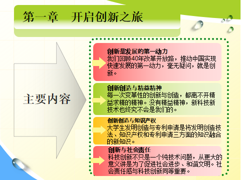 创新已成为我们这个时代的一个主旋律,是大学生必备的素质。在建设创新型国家的过程中,在国家创新体系的构建中,要想在激烈的竞争中立于不败之地,必须要有创新精神。高等学校适应时代要求,大力开展科技创新教育,在国家大力倡导大众创业、万众创新的背景下,大学生无疑成为创新队伍中一支主力军。高校全新人才培养模式,开启了你大学生活的创新之旅,本章《开启创新之旅》主要介绍创新是发展的第一动力、创新创造与精益精神、创新创造与知识产权、创新与社会责任四个部分的内容。同学,大学生活有各种各样的度过方式,有的选择专心学习,刻苦钻研,提高自己的专业技能和知识水平;有的选择在部门中担任重要职务,担负起责任,丰富工作经验,为以后进入职场打下坚实的基础;但有的同学选择了参加创新活动与创新训练项目,把自己的创意变成了现实,在实验室做成产品,申报了国家专利,收获了创新创造成果,紧接着又组建了自己的创业团队,参加了“互联网+”大学生创新创业大赛,扩展了眼界与视野。创新创造彰显了当代大学生以青春梦助力中国梦的壮举,你准备好了吗?