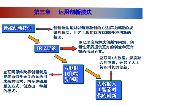 创新技法是指创造学家收集大量成功的创造和创新的实例后,研究其获得成功的思路和过程,经过归纳、分析、总结,找出规律和方法以供人们学习、借鉴和仿效。简言之,创新技法就是创造学家根据创新思维的发展规律而总结出来的一些原理、技巧和方法。创新技法的作用:它可以启发人的创造性思维、应用创新技法可以直接产生创新成果、能够提高人们的创造力和创造成果的实现率。本章的内容围绕着两大知识板块:微观的“传统创新技法与TRIZ理论”和宏观的“互联时代的跨界创新”、“大数据人工智能时代的创新”的相关知识展开。创新技法是解决创新设计问题的创意艺术,是人们对创造性思维和创造理论加以具体化应用的技巧。