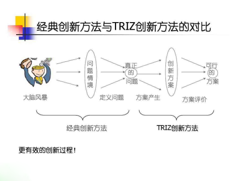 与传统的创新方法相比,TRIZ理论具有鲜明的特点和优势。它成功的为创新工作者揭示了创新发明的内在规律及原理,帮助我们快速的确认并解决系统中存在的矛盾。同时它是以技术发展进化规律为基础来研究整个产品的发展过程,因此,运用TRIZ理论可大大的加快发明创造的速度,并提升产品的创新水平。TRIZ理论为解决创新性问题、创新性矛盾提供更好的创意和更合理的结局方案。它帮助我们打破思维定势,激发创新思维,让我们可以从更广的视角看待问题。