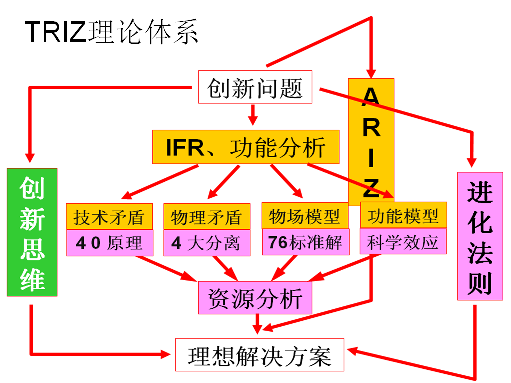 ARIZ――发明问题解决算法。ARIZ(Algorithm for Inventive Problem Solving)被称为发明问题解决算法,它是解决发明问题的完整算法。在解决一些复杂问题时,由于不能分析出明显的矛盾,无法直接依靠矛盾矩阵和物质-场分析解决。ARIZ提供了独特的算法步骤,将复杂、模糊不清的问题情境转化为明确的发明问题。运用ARIZ提供的步骤流程,初始问题最根本的冲突被清楚地显示出来,是否能够求解非常清晰。