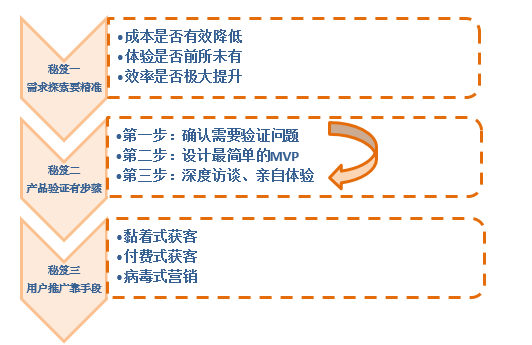 移动互联网时代,“得用户者得天下”已成为创业成功的金科玉律,用户是互联网企业最为基本、最为紧俏的资产。察看当今互联网三大巨头百度、阿里巴巴、腾讯,无一不是靠宏大的用户资源而风声水起并雄霸一方的。在这个人人自称“屌丝”而骨子里却认为自己是“高富帅”和“白富美”的时代里,如何才能与用户谈场惊天地、泣鬼神的旷世之恋呢?方法秘笈一需求探索要精准,开始创业时什么最重要?产品、团队、商业模式?这些当然都重要,但回归商业本质来看,只有被需要才是做好一切的基础,而这也恰好是产品的卖点。那如何才能打造出具有雪中送炭、不可替代功效的刚需产品呢?其实就是三件事:成本是否有效降低、体验是否前所未有、效率是否极大提升,只要能做到其中任何一点,都是刚需。方法秘笈二产品验证有步骤,市场从来不是一个耐心的等待者,好的产品和服务往往是从不完美开始的,是在不断验证中成长的。产品验证的过程就是把最小功能产品,MVP(MinimumViable Product)推给核心用户体验的过程,就是建立产品和服务与用户紧密联系的过程。产品验证第一步确认最需要验证的一个问题,是一个而非两个或多个,是最拿不准但又很关键的一个问题;第二步针对问题设计最简单、最有效的MVP,请核心用户体验;第三步收集数据、深度访谈、亲自体验,再好的数据和访谈都是来自他人的使用感,都无法代替个人的亲自体验,创业者要成为一个“核心用户”,让真实的使用体验来说话。方法秘笈三用户推广靠手段,精益创业的跑道跑完之前,一定要飞起来,那如何加速获取用户、留存用户就成为创业者面临的一大挑战。客户获取方式多种多样,有服务领域常用的黏着式获客,有游戏行业常用的付费式获客,还有面向消费者的病毒式营销。创业是一种心态,更是一种技能,精益创业法可以最大化减少不必要的浪费,少走弯路,一步一步地教你无限逼近正确的需求和解决方案,突破创业期的重重迷雾。