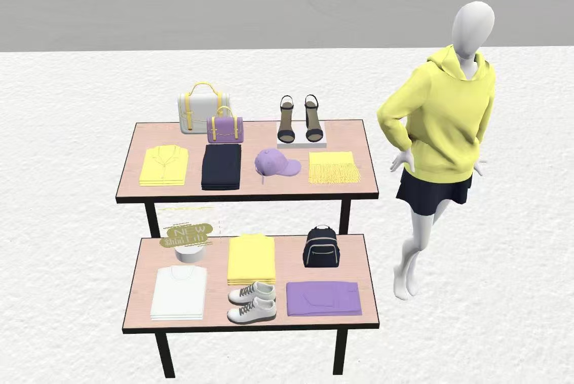 【要求】:针对考场中一组有问题的流水台陈列组合,在答题处的一组子母式流水台、一组中岛货架、一个模特上重新进行正确的陈列调整,采用中岛货架+模特+流水台的组合形式,进行服装色彩搭配、流水台货品陈列组合形式的调整,陈列主题为夏装上新,主色调为“绿色”,整体色彩采用对比色的陈列手法进行组合(有彩色最多不超过3个),整体陈列符合休闲女装的陈列规范、造型美观,色调统一且符合题目要求。