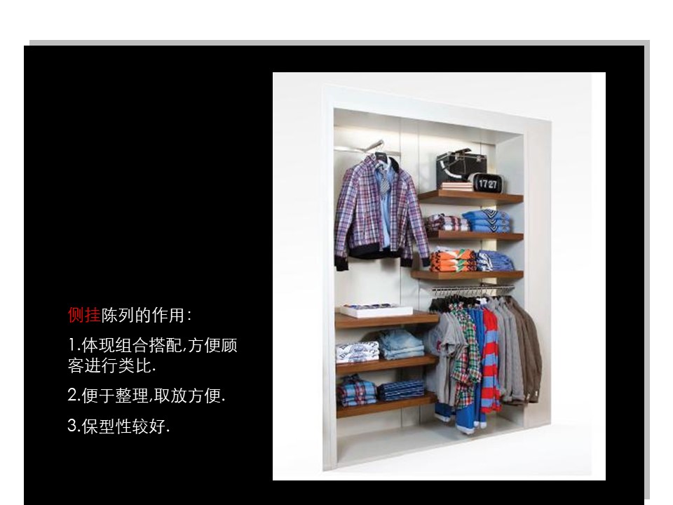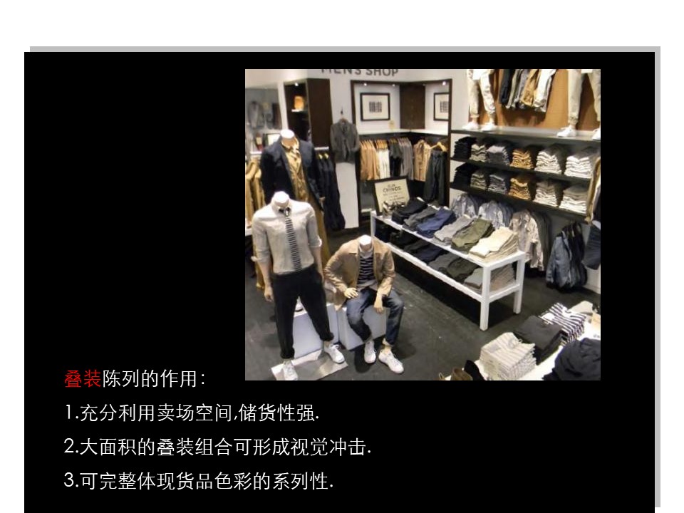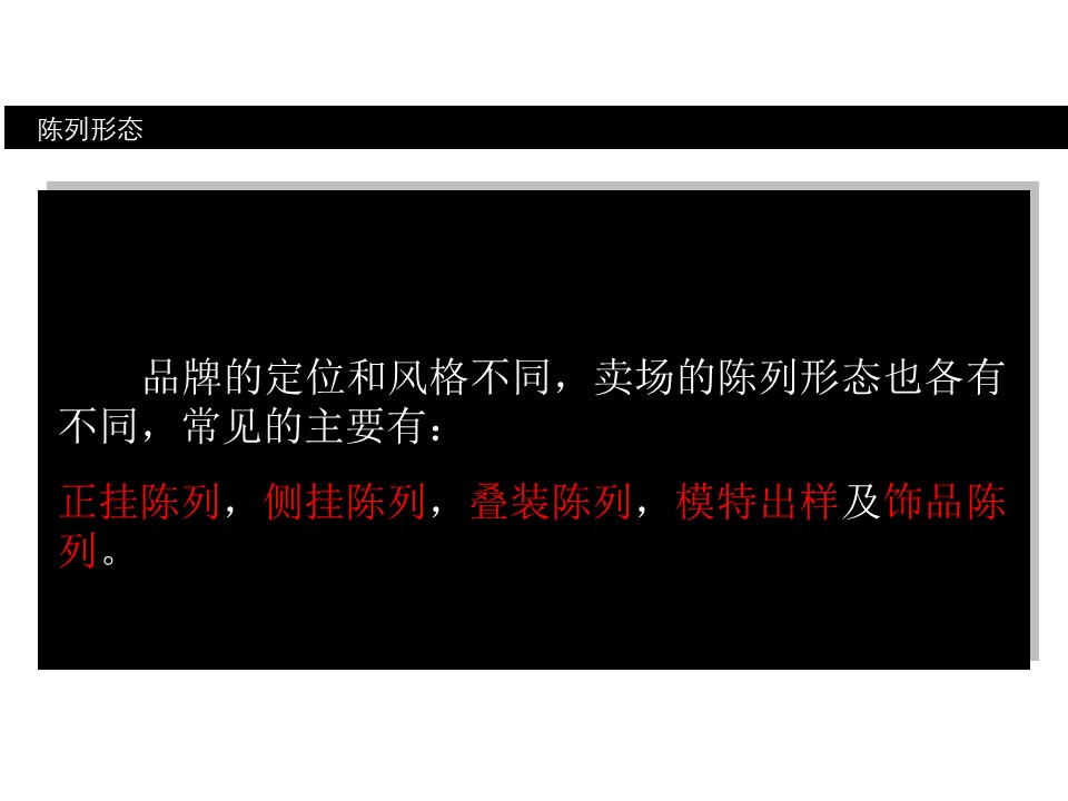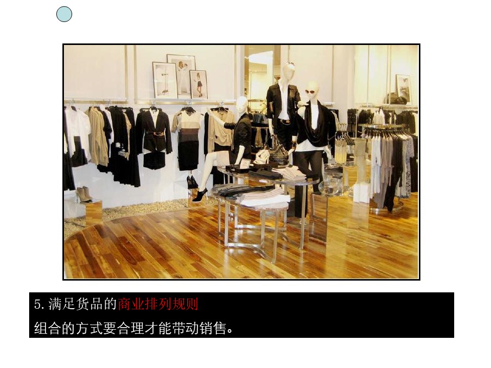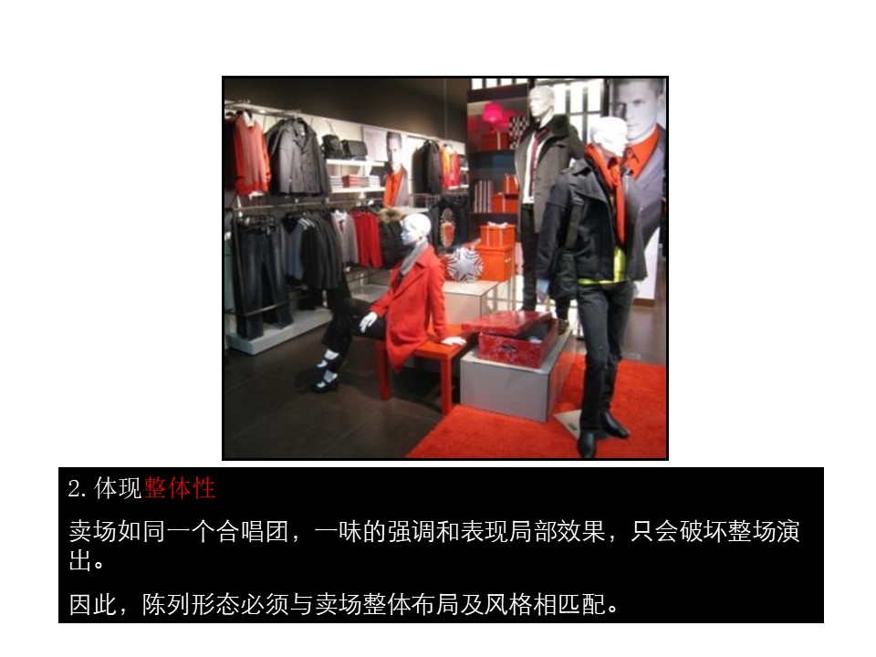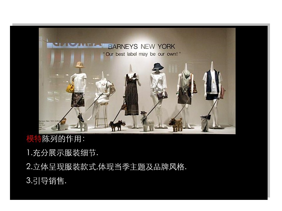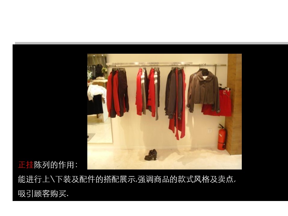 就是服装在卖场中呈现的造型和组合方式。要做的就是服装在等待过程中吸引顾客的注意。要求充分展示服装的美感,款式特点和品牌风格。