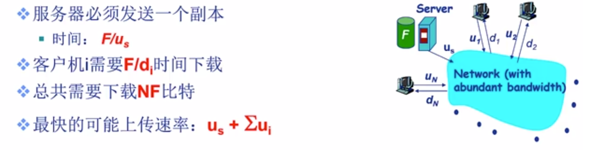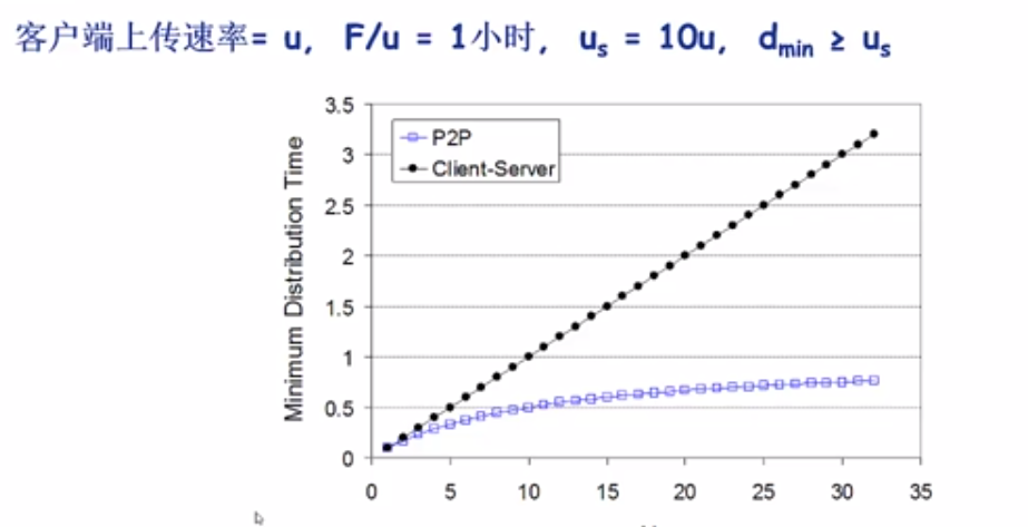 (2) P2P与C/S模式,对于文件分发应用,在传输速率上的对比图: